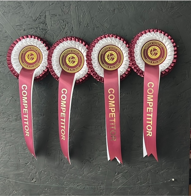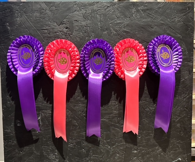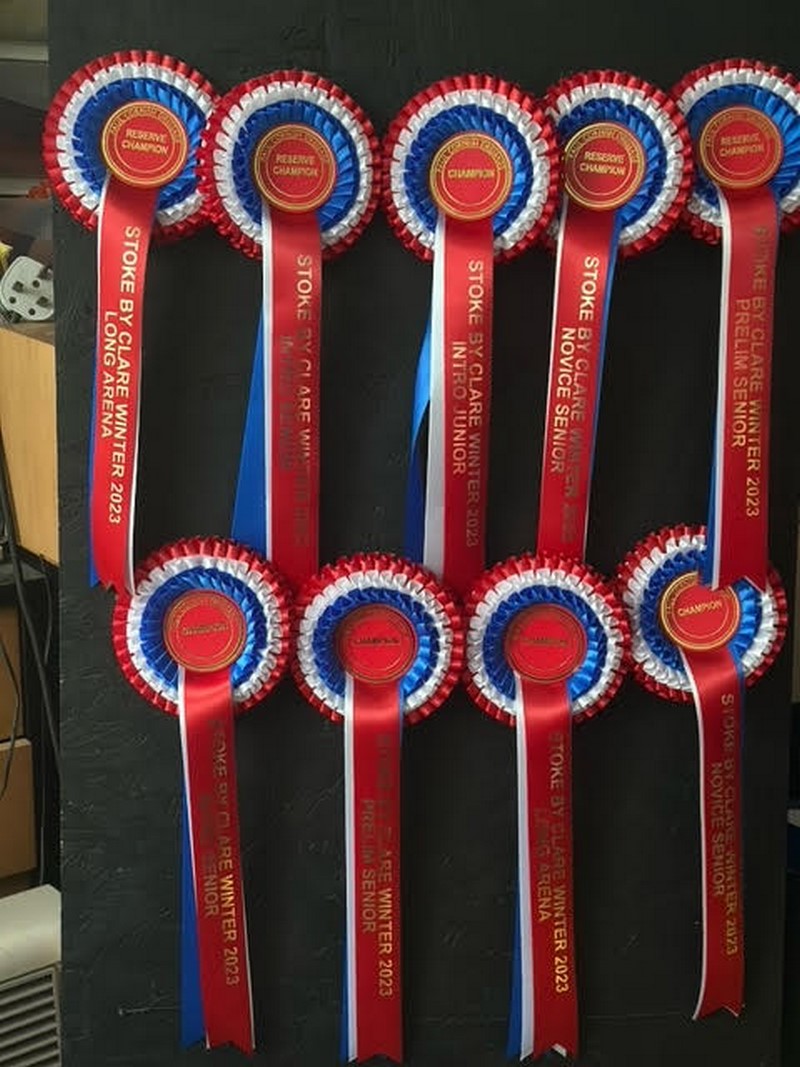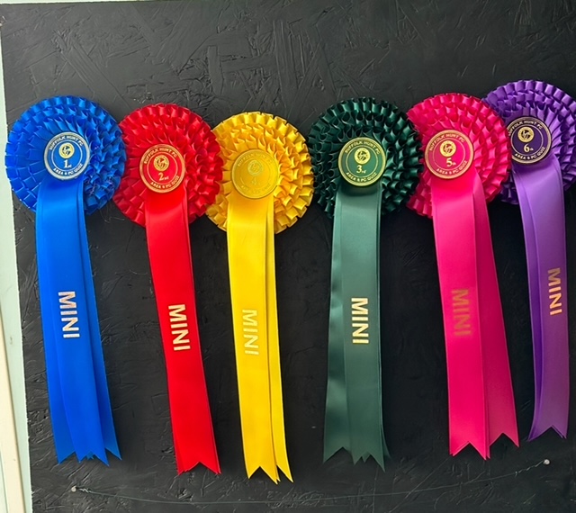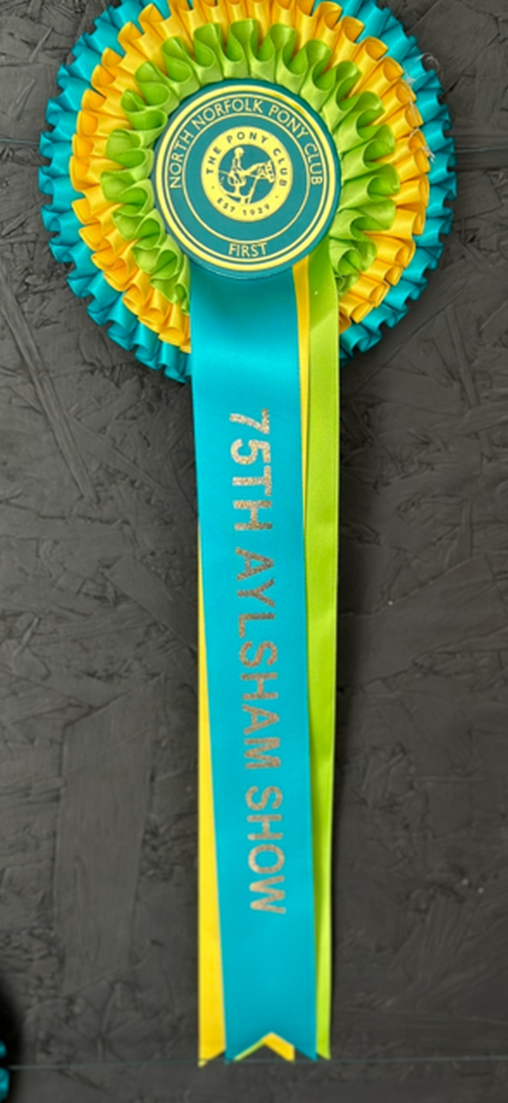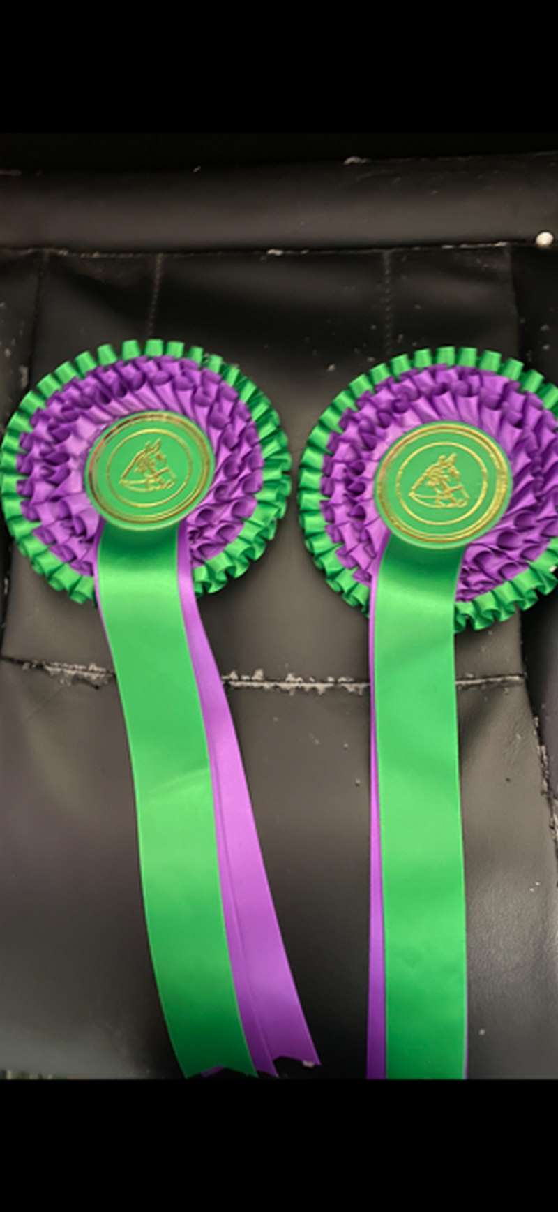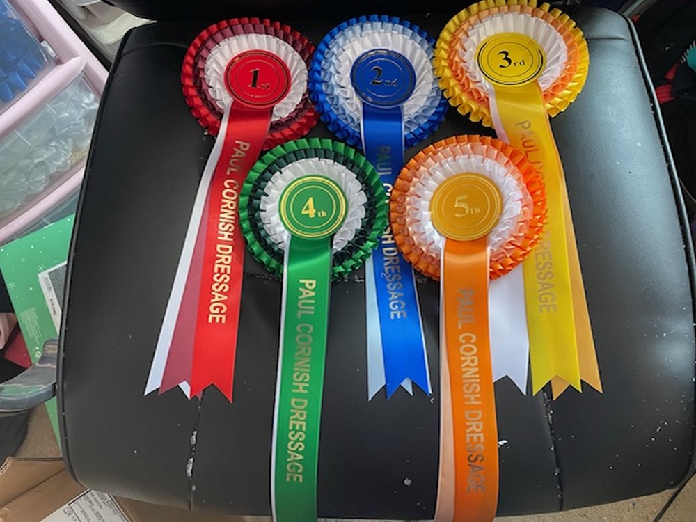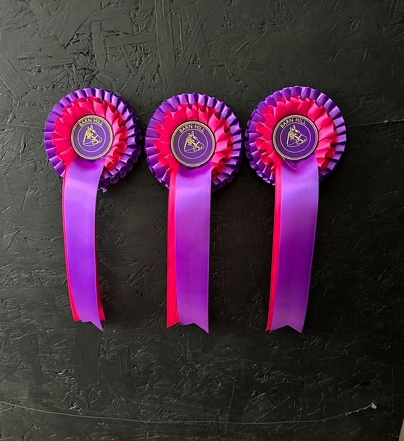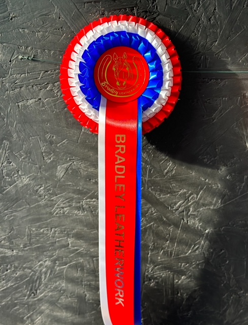 Rosettes can be made with either bridle hooks, safety pins or tapes. Printed tails are available plus the name of your show/event can be added to the centre disc We are happy to post orders at client cost – all orders are sent Royal Mail tracked, insured and signed for.